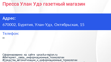 Пресса Улан-Удэ, газетный магазин по адресу 670002, Бурятия, Улан-Удэ, Октябрьская, 15 в дальнейшем Организация, размещена в следующих категориях: