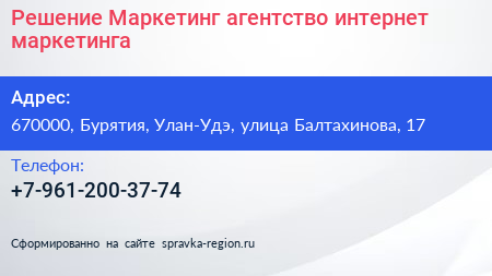 Решение Маркетинг, агентство интернет-маркетинга по адресу 670000, Бурятия, Улан-Удэ, улица Балтахинова, 17 в дальнейшем Организация, размещена в следующих категориях:
