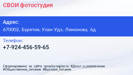 СВОИ, фотостудия по адресу 670002, Бурятия, Улан-Удэ, Лимонова, 6д в дальнейшем Организация, размещена в следующих категориях: