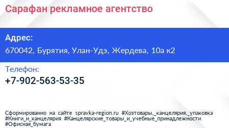 Сарафан, рекламное агентство по адресу 670042, Бурятия, Улан-Удэ, Жердева, 10а к2 в дальнейшем Организация, размещена в следующих категориях: