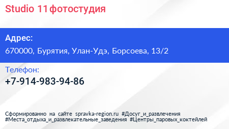 Studio 11, фотостудия по адресу 670000, Бурятия, Улан-Удэ, Борсоева, 13/2 в дальнейшем Организация, размещена в следующих категориях:
