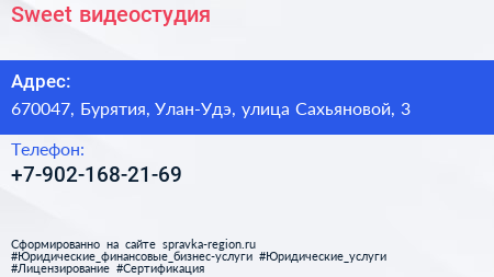 Sweet, видеостудия по адресу 670047, Бурятия, Улан-Удэ, улица Сахьяновой, 3 в дальнейшем Организация, размещена в следующих категориях: