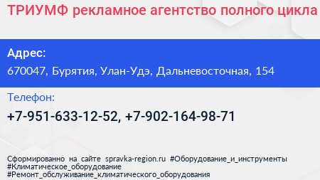 ТРИУМФ, рекламное агентство полного цикла по адресу 670047, Бурятия, Улан-Удэ, Дальневосточная, 154 в дальнейшем Организация, размещена в следующих категориях: