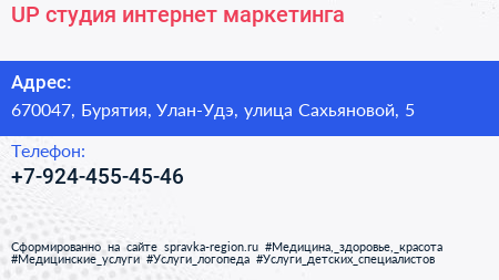UP, студия интернет-маркетинга по адресу 670047, Бурятия, Улан-Удэ, улица Сахьяновой, 5 в дальнейшем Организация, размещена в следующих категориях: