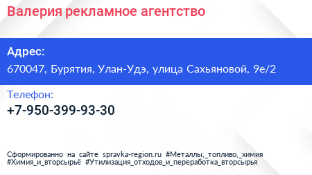 Валерия, рекламное агентство по адресу 670047, Бурятия, Улан-Удэ, улица Сахьяновой, 9е/2 в дальнейшем Организация, размещена в следующих категориях: