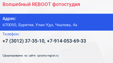 Волшебный REBOOT, фотостудия по адресу 670050, Бурятия, Улан-Удэ, Чкалова, 4а в дальнейшем Организация, размещена в следующих категориях: