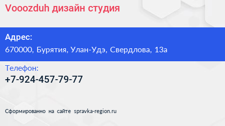 Vooozduh, дизайн-студия по адресу 670000, Бурятия, Улан-Удэ, Свердлова, 13а в дальнейшем Организация, размещена в следующих категориях: