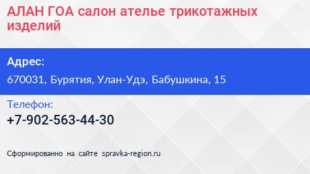АЛАН ГОА, салон-ателье трикотажных изделий по адресу 670031, Бурятия, Улан-Удэ, Бабушкина, 15 в дальнейшем Организация, размещена в следующих категориях: