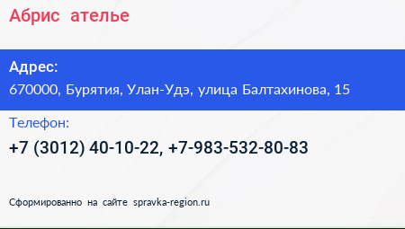 Абрис+, ателье по адресу 670000, Бурятия, Улан-Удэ, улица Балтахинова, 15 в дальнейшем Организация, размещена в следующих категориях: