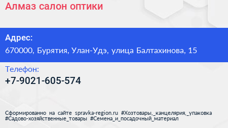 Алмаз, салон оптики по адресу 670000, Бурятия, Улан-Удэ, улица Балтахинова, 15 в дальнейшем Организация, размещена в следующих категориях: