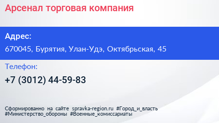 Арсенал, торговая компания по адресу 670045, Бурятия, Улан-Удэ, Октябрьская, 45 в дальнейшем Организация, размещена в следующих категориях: