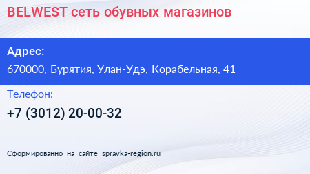 BELWEST, сеть обувных магазинов по адресу 670000, Бурятия, Улан-Удэ, Корабельная, 41 в дальнейшем Организация, размещена в следующих категориях: