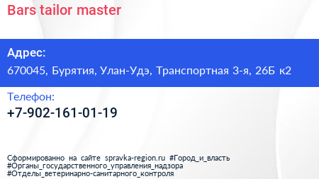 Bars tailor master по адресу 670045, Бурятия, Улан-Удэ, Транспортная 3-я, 26Б к2 в дальнейшем Организация, размещена в следующих категориях:
