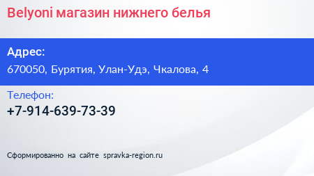 Belyoni, магазин нижнего белья по адресу 670050, Бурятия, Улан-Удэ, Чкалова, 4 в дальнейшем Организация, размещена в следующих категориях: