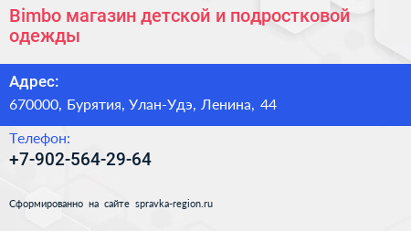 Bimbo, магазин детской и подростковой одежды по адресу 670000, Бурятия, Улан-Удэ, Ленина, 44 в дальнейшем Организация, размещена в следующих категориях: