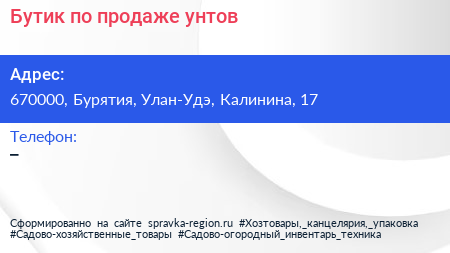 Бутик по продаже унтов по адресу 670000, Бурятия, Улан-Удэ, Калинина, 17 в дальнейшем Организация, размещена в следующих категориях: