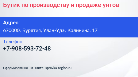 Бутик по производству и продаже унтов по адресу 670000, Бурятия, Улан-Удэ, Калинина, 17 в дальнейшем Организация, размещена в следующих категориях: