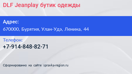 DLF Jeanplay, бутик одежды по адресу 670000, Бурятия, Улан-Удэ, Ленина, 44 в дальнейшем Организация, размещена в следующих категориях: