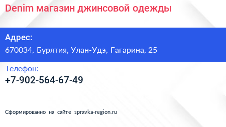 Denim, магазин джинсовой одежды по адресу 670034, Бурятия, Улан-Удэ, Гагарина, 25 в дальнейшем Организация, размещена в следующих категориях: