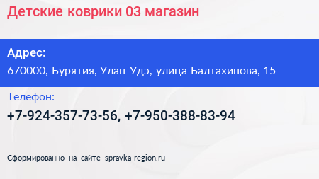 Детские коврики 03, магазин по адресу 670000, Бурятия, Улан-Удэ, улица Балтахинова, 15 в дальнейшем Организация, размещена в следующих категориях: