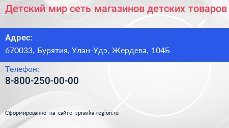 Детский мир, сеть магазинов детских товаров по адресу 670033, Бурятия, Улан-Удэ, Жердева, 104Б в дальнейшем Организация, размещена в следующих категориях: