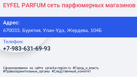 EYFEL PARFUM, сеть парфюмерных магазинов по адресу 670033, Бурятия, Улан-Удэ, Жердева, 104Б в дальнейшем Организация, размещена в следующих категориях:
