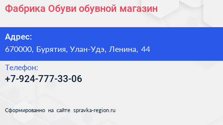 Фабрика Обуви, обувной магазин по адресу 670000, Бурятия, Улан-Удэ, Ленина, 44 в дальнейшем Организация, размещена в следующих категориях: