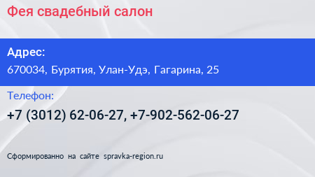 Фея, свадебный салон по адресу 670034, Бурятия, Улан-Удэ, Гагарина, 25 в дальнейшем Организация, размещена в следующих категориях: