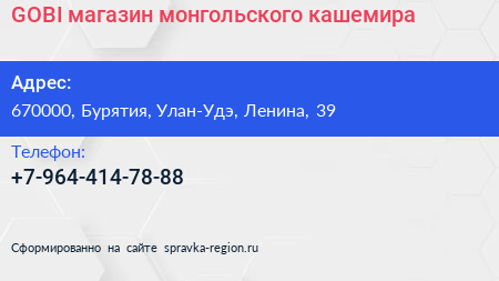 GOBI, магазин монгольского кашемира по адресу 670000, Бурятия, Улан-Удэ, Ленина, 39 в дальнейшем Организация, размещена в следующих категориях: