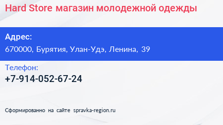 Hard Store, магазин молодежной одежды по адресу 670000, Бурятия, Улан-Удэ, Ленина, 39 в дальнейшем Организация, размещена в следующих категориях: