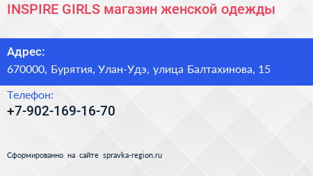 INSPIRE GIRLS, магазин женской одежды по адресу 670000, Бурятия, Улан-Удэ, улица Балтахинова, 15 в дальнейшем Организация, размещена в следующих категориях: