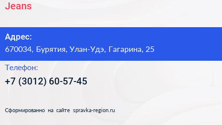 Jeans по адресу 670034, Бурятия, Улан-Удэ, Гагарина, 25 в дальнейшем Организация, размещена в следующих категориях:
