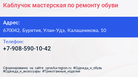 Каблучок, мастерская по ремонту обуви по адресу 670042, Бурятия, Улан-Удэ, Калашникова, 10 в дальнейшем Организация, размещена в следующих категориях: