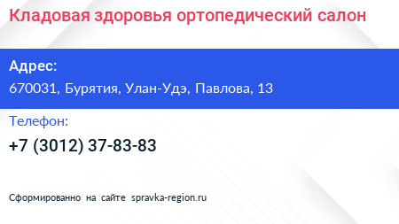 Кладовая здоровья, ортопедический салон по адресу 670031, Бурятия, Улан-Удэ, Павлова, 13 в дальнейшем Организация, размещена в следующих категориях: