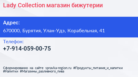 Lady Collection, магазин бижутерии по адресу 670000, Бурятия, Улан-Удэ, Корабельная, 41 в дальнейшем Организация, размещена в следующих категориях: