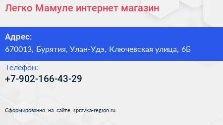 Легко Мамуле, интернет-магазин по адресу 670013, Бурятия, Улан-Удэ, Ключевская улица, 6Б в дальнейшем Организация, размещена в следующих категориях:
