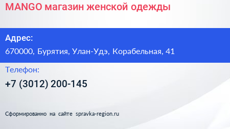MANGO, магазин женской одежды по адресу 670000, Бурятия, Улан-Удэ, Корабельная, 41 в дальнейшем Организация, размещена в следующих категориях: