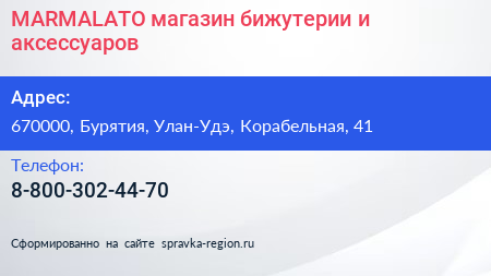 MARMALATO, магазин бижутерии и аксессуаров по адресу 670000, Бурятия, Улан-Удэ, Корабельная, 41 в дальнейшем Организация, размещена в следующих категориях: