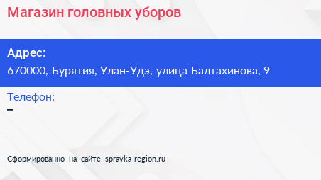 Магазин головных уборов по адресу 670000, Бурятия, Улан-Удэ, улица Балтахинова, 9 в дальнейшем Организация, размещена в следующих категориях: