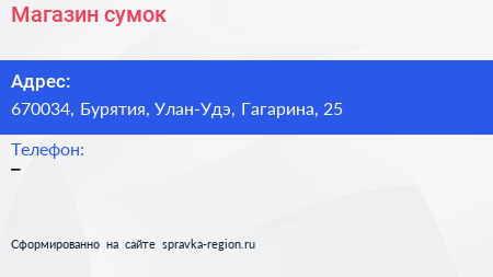 Магазин сумок по адресу 670034, Бурятия, Улан-Удэ, Гагарина, 25 в дальнейшем Организация, размещена в следующих категориях: