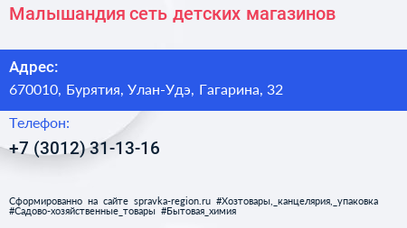 Малышандия, сеть детских магазинов по адресу 670010, Бурятия, Улан-Удэ, Гагарина, 32 в дальнейшем Организация, размещена в следующих категориях: