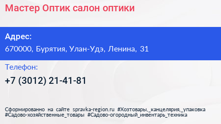 Мастер Оптик, салон оптики по адресу 670000, Бурятия, Улан-Удэ, Ленина, 31 в дальнейшем Организация, размещена в следующих категориях: