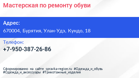 Мастерская по ремонту обуви по адресу 670004, Бурятия, Улан-Удэ, Кундо, 18 в дальнейшем Организация, размещена в следующих категориях: