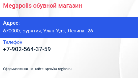 Megapolis, обувной магазин по адресу 670000, Бурятия, Улан-Удэ, Ленина, 26 в дальнейшем Организация, размещена в следующих категориях: