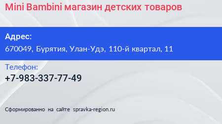 Mini Bambini, магазин детских товаров по адресу 670049, Бурятия, Улан-Удэ, 110-й квартал, 11 в дальнейшем Организация, размещена в следующих категориях:
