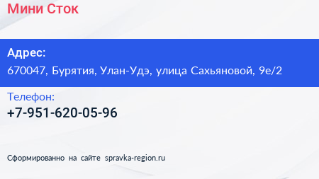 Мини Сток по адресу 670047, Бурятия, Улан-Удэ, улица Сахьяновой, 9е/2 в дальнейшем Организация, размещена в следующих категориях: