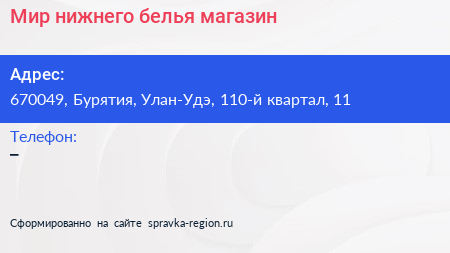 Мир #нижнего белья, магазин по адресу 670049, Бурятия, Улан-Удэ, 110-й квартал, 11 в дальнейшем Организация, размещена в следующих категориях: