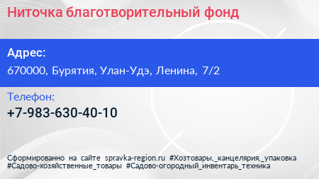 Ниточка, благотворительный фонд по адресу 670000, Бурятия, Улан-Удэ, Ленина, 7/2 в дальнейшем Организация, размещена в следующих категориях: