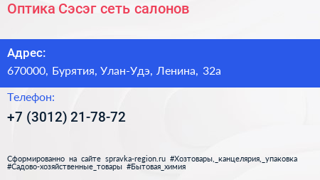 Оптика Сэсэг, сеть салонов по адресу 670000, Бурятия, Улан-Удэ, Ленина, 32а в дальнейшем Организация, размещена в следующих категориях: