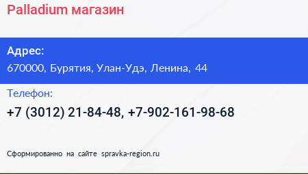 Palladium, магазин по адресу 670000, Бурятия, Улан-Удэ, Ленина, 44 в дальнейшем Организация, размещена в следующих категориях: